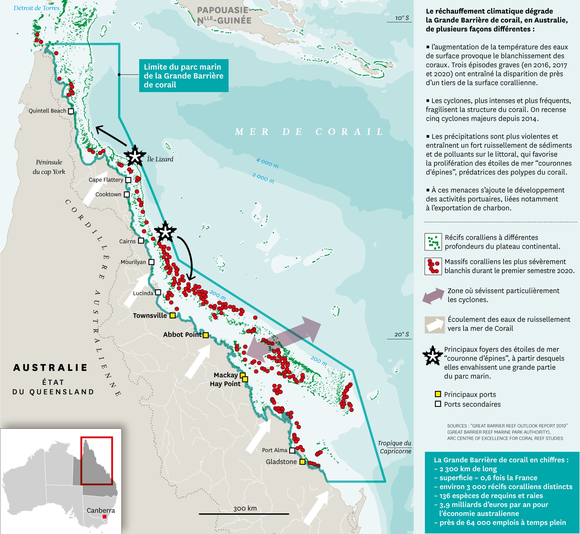 Soit en navigant à partir de l'entrée sud de la barrière de Corail [au niveau de Gladstone : Quennsland, Australie].